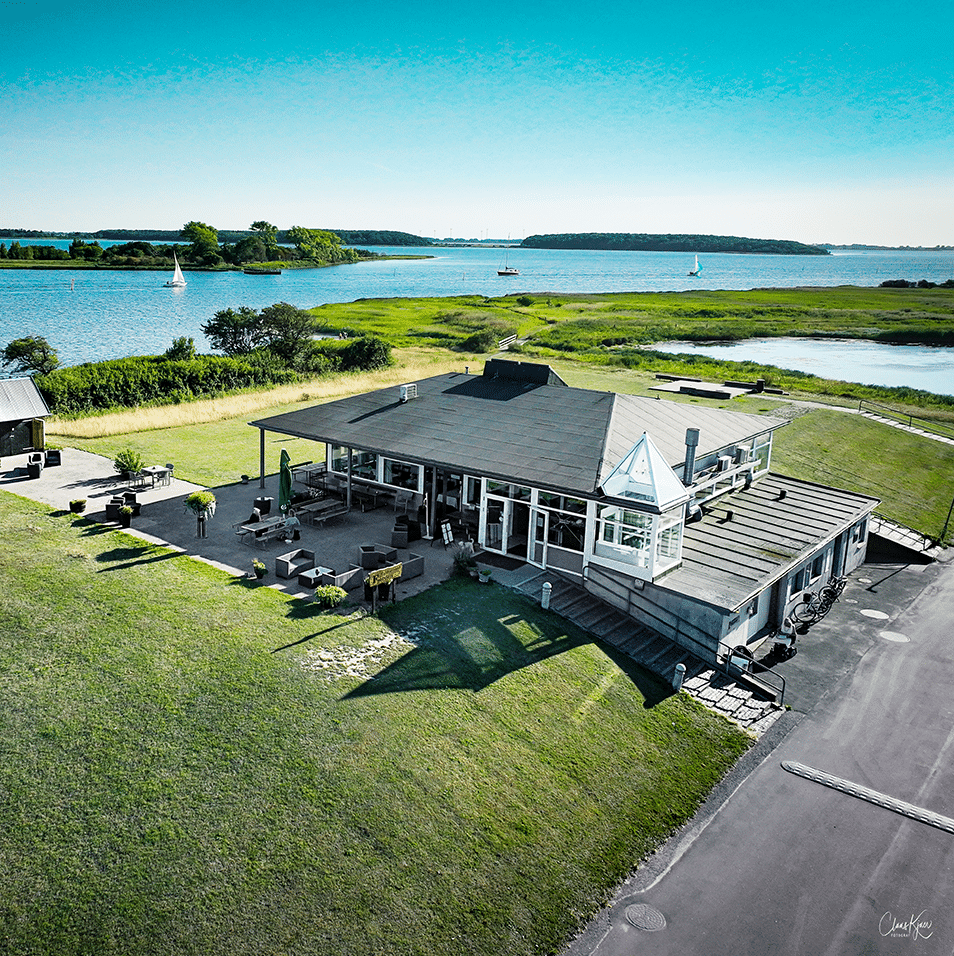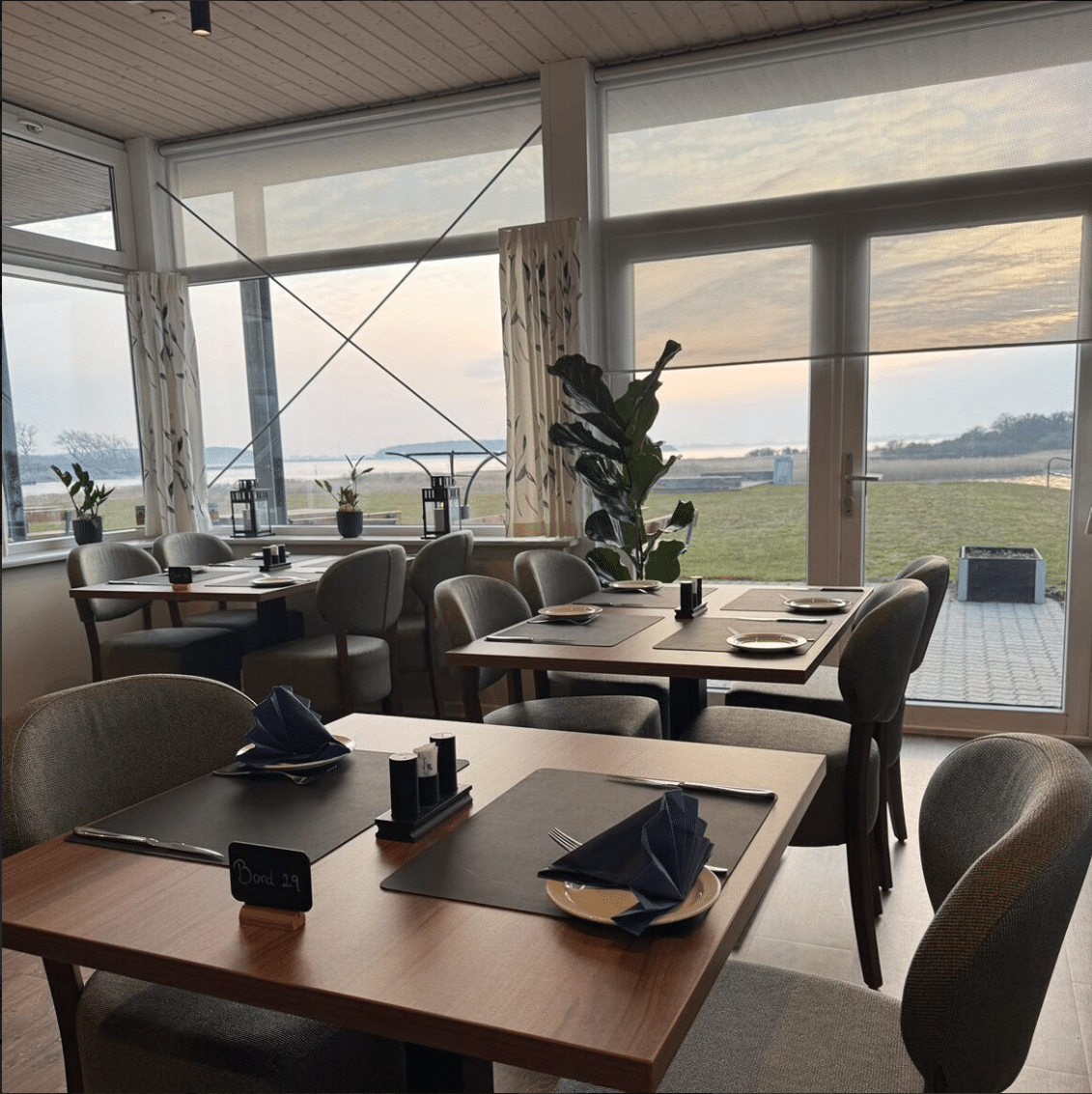 Restaurant Fjorden ligger smukt og idyllisk på en høj med en pragtfuld udsigt over Nakskov Fjord med vand på alle sider.